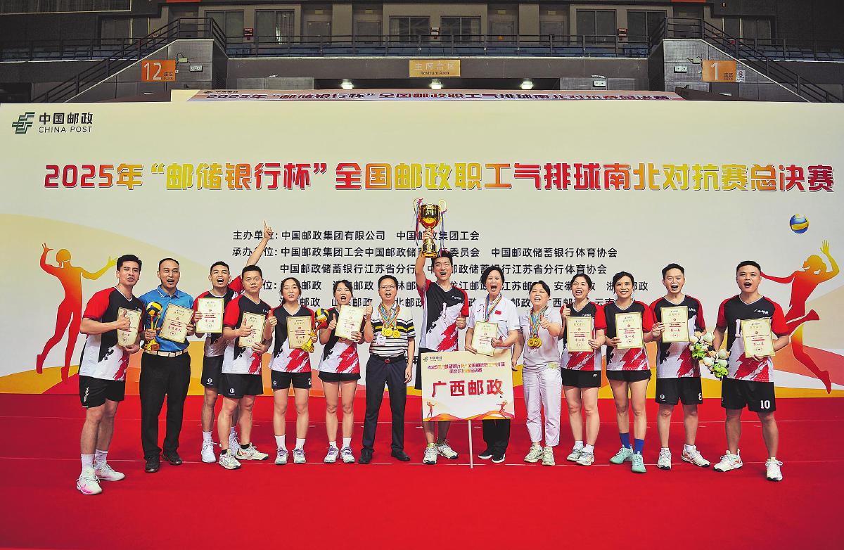 廣西郵政隊(duì)奪冠,隊(duì)員合影慶祝。