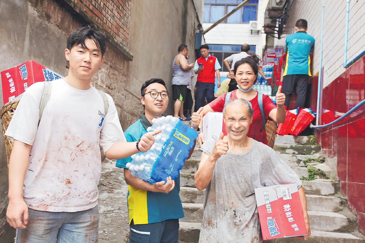 沒過多久,受災居民陸續(xù)趕來。他們有的背著背簍,有的赤著腳,褲腳上沾滿了泥土,衣衫被汗水濕透。餐飲店經(jīng)營者丁平拿到物資后,連連道謝:“太感謝你們了,這些物資真是解了我的燃眉之急!”