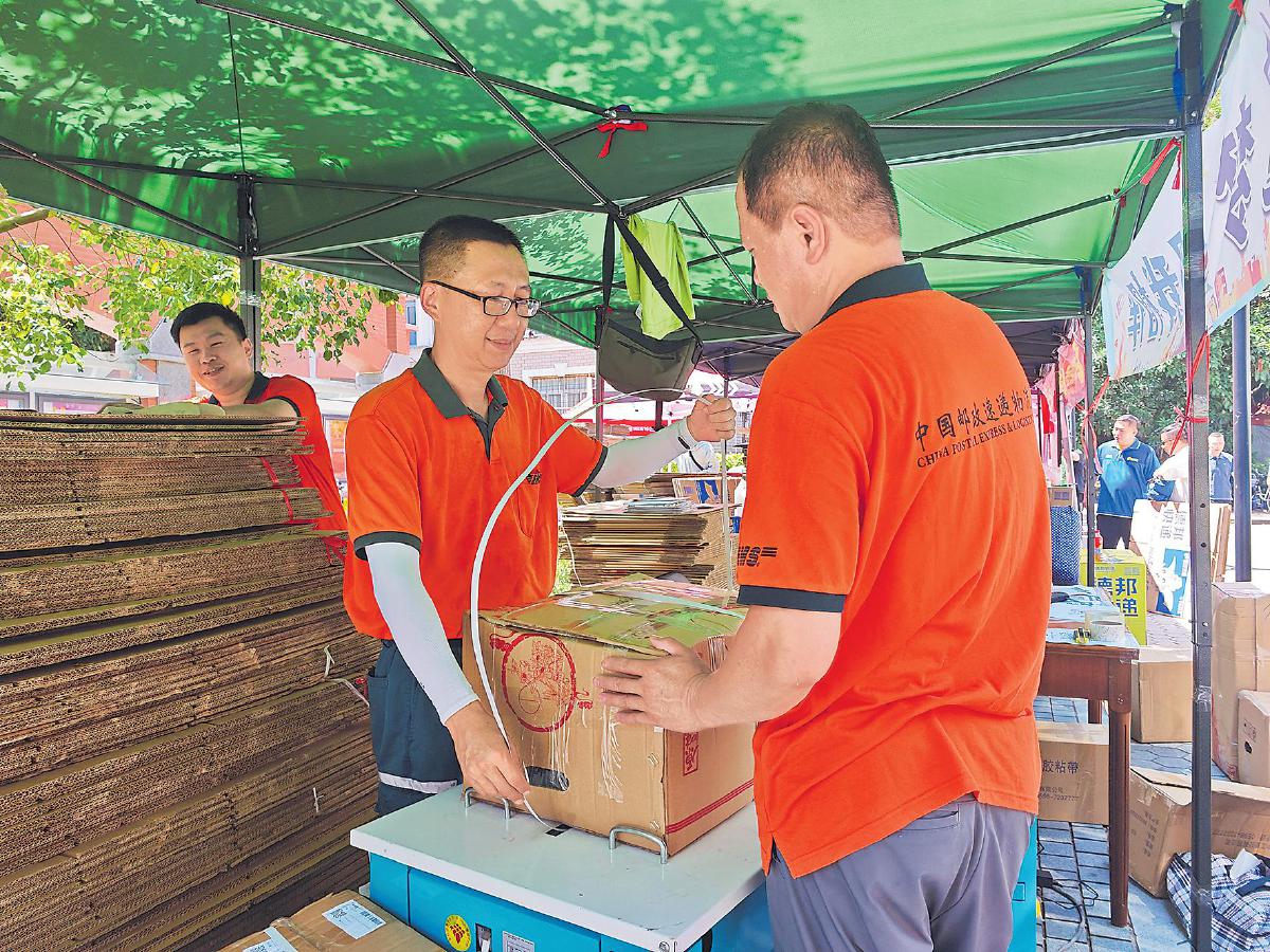 肖梅濱(中)和同事正在打包郵件。