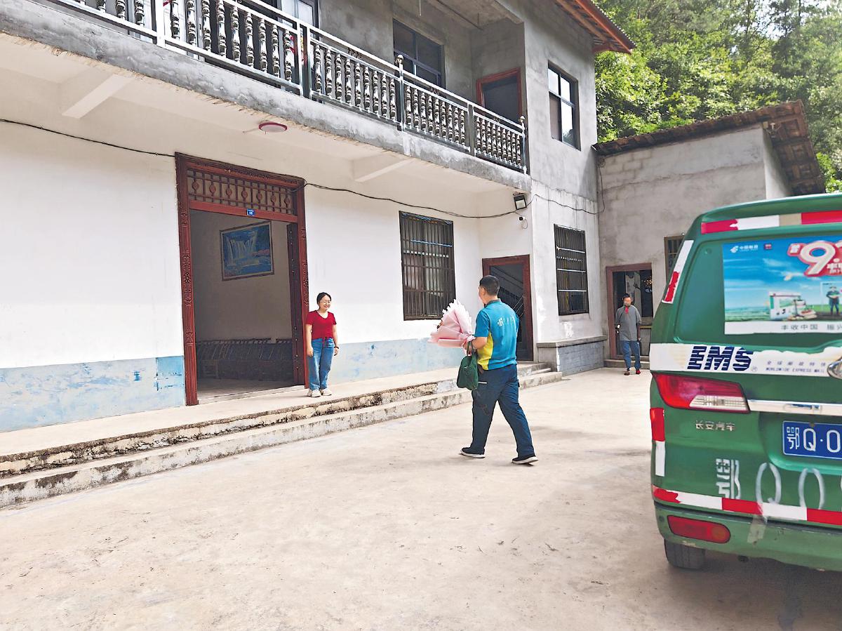 盛夏時(shí)節(jié),湖北省恩施土家族苗族自治州青果山村,蒼翠的群山中,一輛郵車穿梭其間。行駛將近1小時(shí),隨著郵車再次轉(zhuǎn)過(guò)一個(gè)急彎、進(jìn)入一處山坳,一排盛放的木槿花旁,一座雙層民居映入眼簾。郵政投遞員張安兵踩下剎車,拿起裝著武漢大學(xué)錄取通知書的郵件,捧著一束鮮花從車上走下。