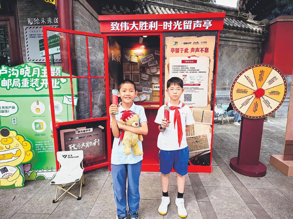 8月15日,“致敬偉大勝利”及烽火家信系列活動在北京市豐臺區宛平城啟動。該活動由百度App聯合新華網、軍事博物館、退役軍人事務部、北京市郵政分公司、盧溝橋文化公園等單位共同舉辦。游客在“致偉大勝利”時光留聲亭旁,轉動轉盤即可選擇錄制內容,包括參觀抗戰展陳的體會、朗讀一封感人的抗戰家書或唱一首經典革命歌曲,產生的優質視頻素材將由權威媒體整理后發布。參加“時光留聲”錄制的游客還可到旁邊的盧溝曉月主題郵局領取抗戰家書主題明信片,加蓋專屬紀念戳或購買其他文創產品。