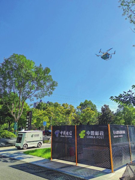 8月20日,在安徽省合肥市政務中心中國郵政無人機物流樞紐站,無人機啟程配送無人車送來的郵件。