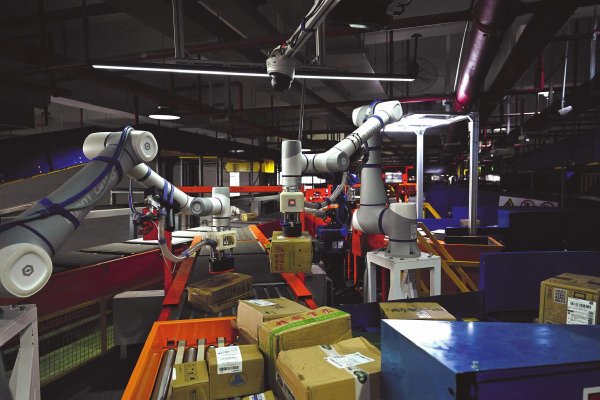 8月19日,在安徽省合肥郵區中心,雙臂供件機器人在抓取分揀快遞郵件。