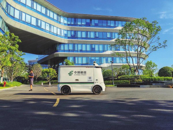 8月20日,在安徽省合肥市科大訊飛小鎮,郵政無人車在配送郵件。