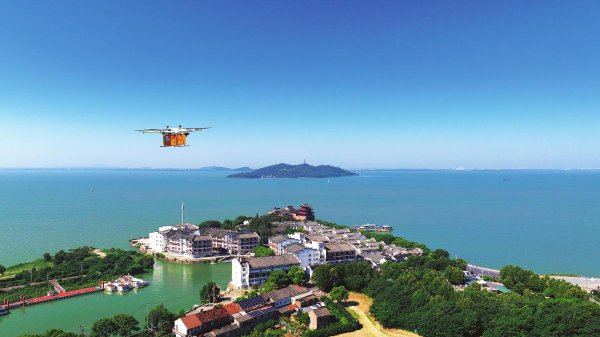 8月19日,在安徽省合肥市巢湖上空,無人機在配送快遞包裹(無人機照片)。