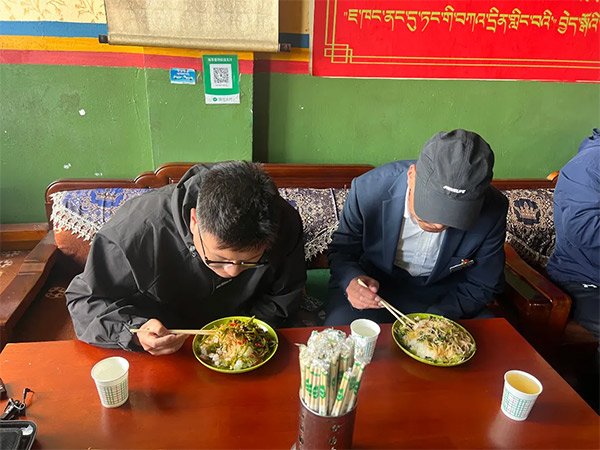 午飯時間,鄉政府旁的索多藏餐館里擠滿了來用餐的人。有觀光的游客,有像我們一樣到這里工作的外鄉人,還有本地的老百姓。記者和曲巴一起回憶起10年前在普瑪江塘只能吃面包、泡面的采訪經歷。曲巴說:“現在鄉上開了3家餐館,大家也能吃上熱乎乎的飯菜了。”記者點了一份青椒肉絲蓋飯,曲巴要了一份小白菜蓋飯。我們吃得一干二凈!