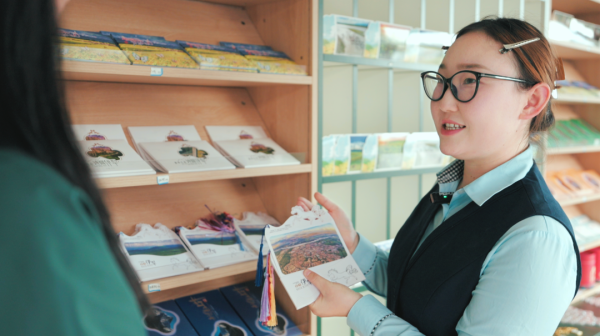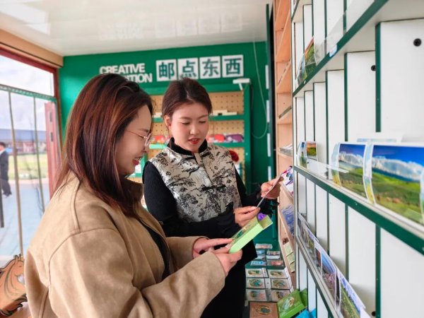 “馬上”郵局營(yíng)業(yè)員彩紅說(shuō):我手里的這款明信片是異形明信片,明信片上是伊犁風(fēng)光,有天馬的元素,還有流蘇,很有設(shè)計(jì)感。我們還開(kāi)發(fā)了以伊犁景點(diǎn)為主題的流沙冰箱貼,其中這款紫色的薰衣草冰箱貼是我們這里的爆款。