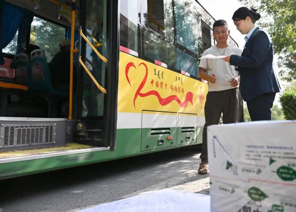 新疆伊犁州米糧泉鄉米糧泉村郵政所工作人員(右)在同公交車司機交接郵件。近年來,伊犁州郵政分公司通過和公交公司合作,利用公交車的冗余載能將郵件投送到村級郵政所,為當地各族群眾帶來便利(9月8日攝)。新華社記者 李賀 攝