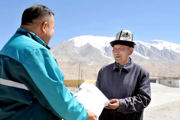 投遞員阿克阿不都賽米·賽買提(左)把包裹送到新疆克孜勒蘇柯爾克孜自治州阿克陶縣布倫口鄉布倫口村夏迪別克·排爾慢手中。郵路延伸到雪山腳下,讓生活在邊疆的各族民眾也能享受到和城市居民一樣快捷方便的郵政服務(9月9日攝)。新華社發
