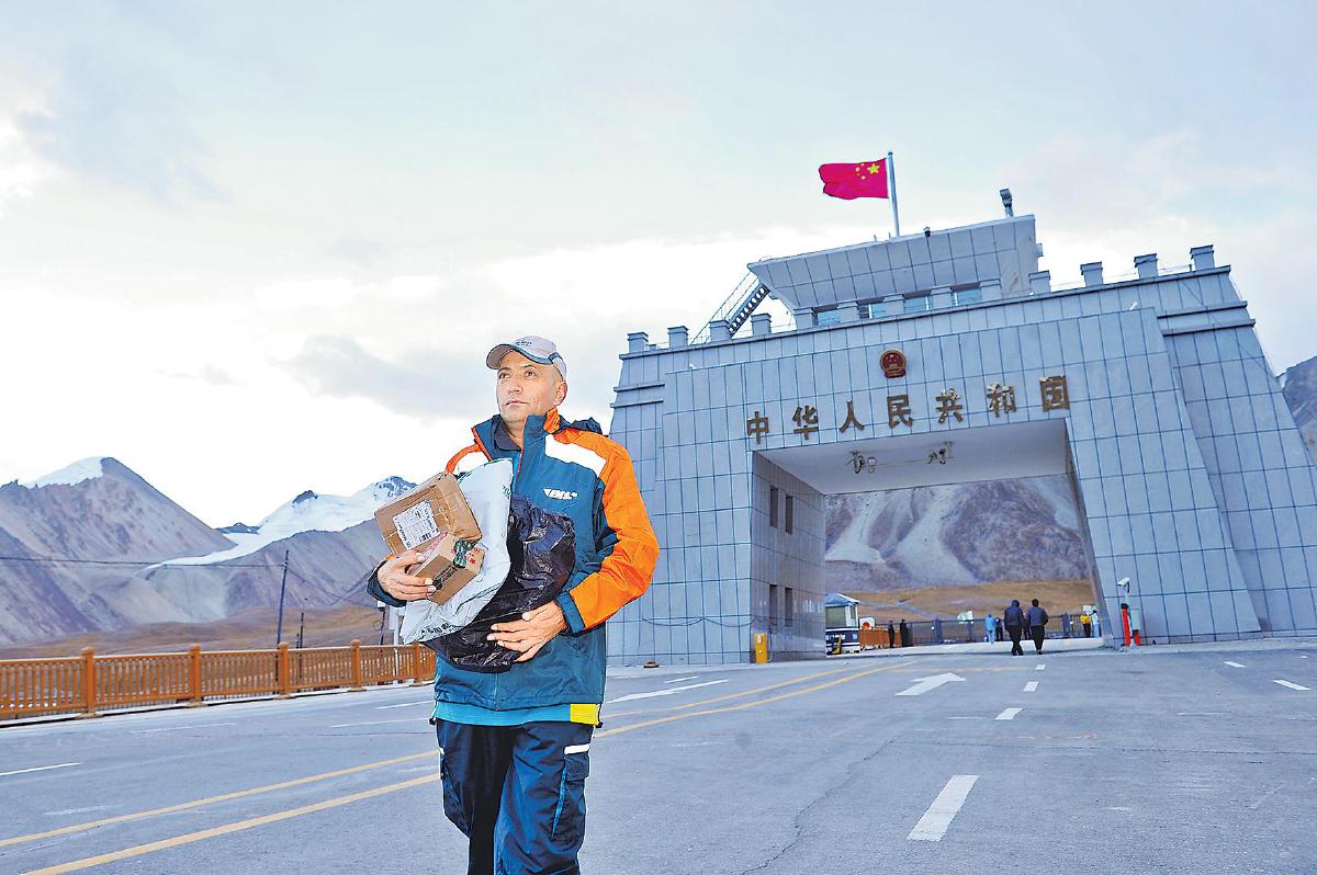 投遞員在紅其拉甫國門投遞郵件。