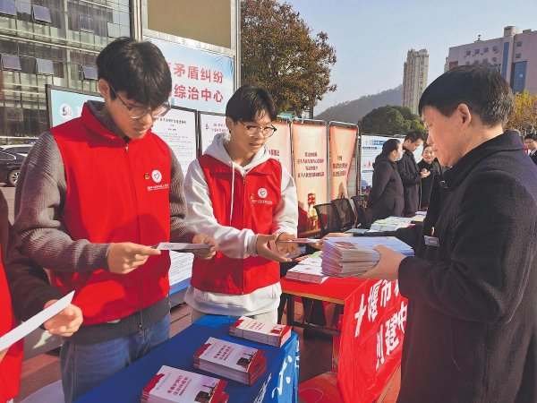 12月1日,2025年湖北省十堰市第八個“憲法宣傳周”啟動儀式暨集中法治宣傳活動在該市人民廣場舉行。十堰市郵政分公司將法律法規宣傳與郵政業務深度融合,通過發放郵資紀念封、加蓋紀念戳、現場答疑解惑等方式,向來往群眾普及法律法規知識,助力營造全社會尊法學法守法用法的良好氛圍。圖為郵政工作人員向現場志愿者發放紀念封。