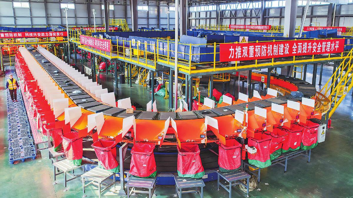 基礎設施迭代升級,處理能力大幅提升。為滿足日益增長的郵件處理需求,輝縣郵政投資超1800萬元將縣級處理中心升級為共配中心。升級后的中心,最引人注目的是164格口自動分揀機——包裹通過傳送帶進入分揀機后,系統會自動識別快遞面單上的地址信息,將包裹分配到對應鄉鎮的格口,整個過程無須人工干預。該中心分揀員郭杰說,分揀效率的提升,讓投遞員出班時間提前了約40分鐘。