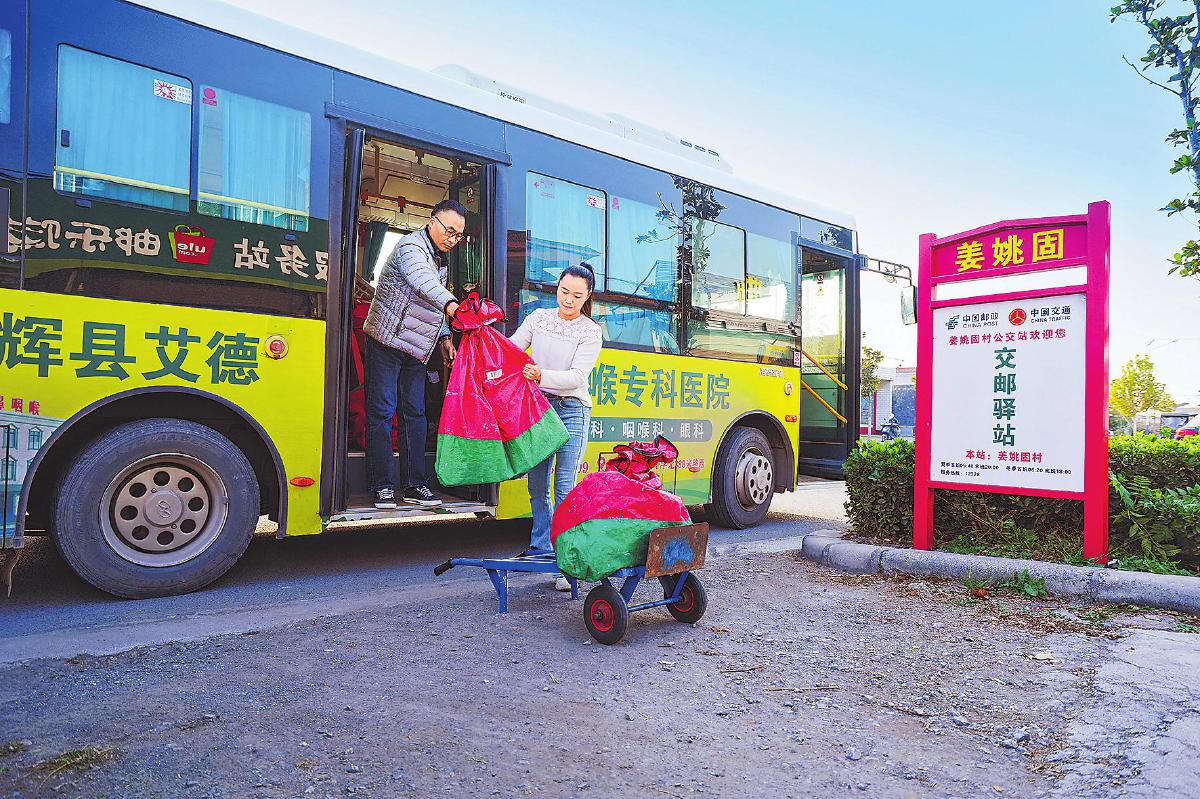 “現在每天收發包裹230多件,包括村民網購的商品,還有準備寄走的土雞蛋、手工粉條等特色農產品。”關亞杰的百貨店也是村級郵政便民服務站,她一邊掃碼錄入信息,一邊指著窗外說,“等公交車一到,待寄的包裹就能直接發往縣城。”