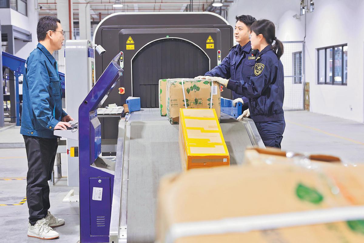 蘇州郵政配備與海關(guān)聯(lián)網(wǎng)的同屏比對(duì)系統(tǒng),通過(guò)網(wǎng)業(yè)聯(lián)動(dòng),做好承運(yùn)商運(yùn)能的分配和管控,持續(xù)提升蘇州及其網(wǎng)絡(luò)輻射區(qū)域出口郵件的通關(guān)效率,幫助跨境電商企業(yè)提升海外市場(chǎng)競(jìng)爭(zhēng)力。同時(shí),海關(guān)與郵政通過(guò)物理隔離、分區(qū)作業(yè)等措施加強(qiáng)對(duì)郵件的監(jiān)管,確保郵件安全。圖為郵政與海關(guān)人員在蘇州國(guó)際郵件互換局對(duì)國(guó)際郵件進(jìn)行過(guò)機(jī)安檢。