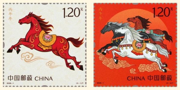 《丙午年》特種郵票全套共2枚。第一枚圖名為“馳躍宏圖”,圖中紅馬踏云、鬃毛如焰,表達了在新的一年里,對黨全面領導下國家經濟社會發展繼續行穩致遠,向著“十五五”時期主要目標接續奮進的美好期許。第二枚圖名為“萬駿臻福”,圖中三駿并馳、祥紋環繞,象征全國各族人民凝聚磅礴合力,在全面建設社會主義現代化國家、全面推進中華民族偉大復興征程上協力同心。