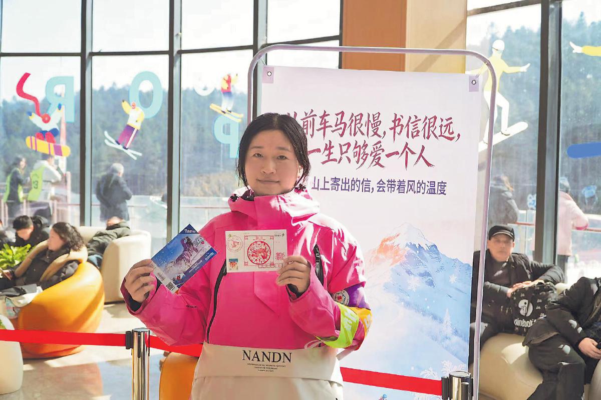 滑雪愛好者展示賽事聯(lián)名款明信片。