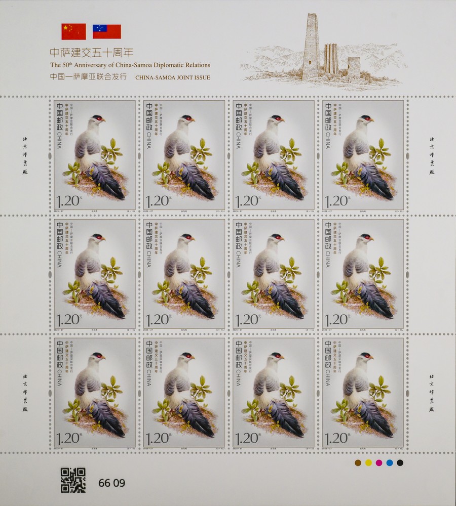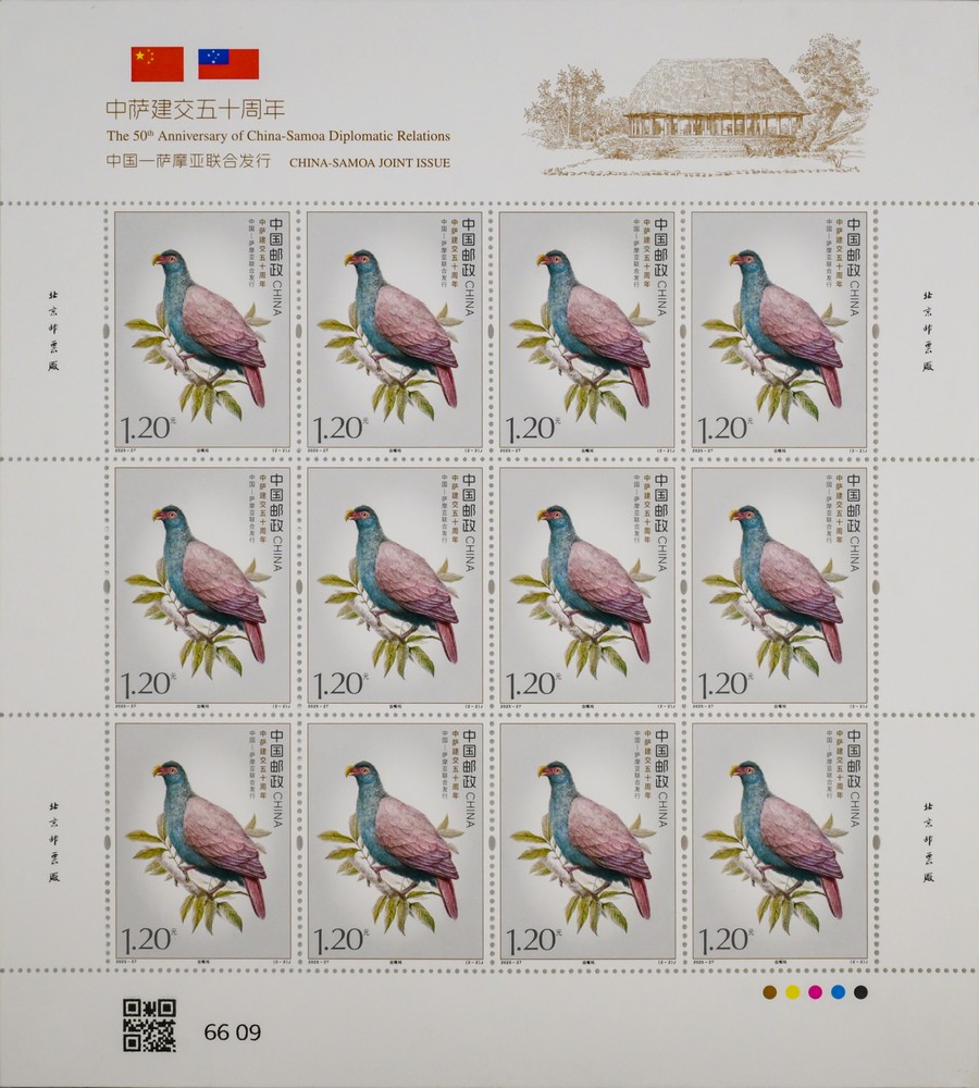 本套郵票以兩國的特色鳥類為核心設計元素,融西方鋼筆線條與東方淡彩的表現技法,筆觸細膩傳神,形象生動逼真,兩只禽鳥顧盼相應、神氣貫連,洋溢著蓬勃的生命力。本套郵票既展現兩國獨特的自然生態之美,更傳遞出兩國友誼的深厚底蘊與美好未來。第一枚郵票表現了“白馬雞”。作為四川丹巴莫斯卡鳥類重要棲息地的主要保護物種,白馬雞也成為丹巴自然生態的鮮活代表,當地獨特的高原氣候、適宜的生態環境為其提供了理想生存空間。第二枚郵票表現了“齒嘴鳩”。作為薩摩亞的本土特有鳥類,齒嘴鳩不僅是當地生態系統的重要成員,更被視為薩摩亞自然與文化遺產的象征,承載著薩摩亞人民對家鄉土地的熱愛與珍視。